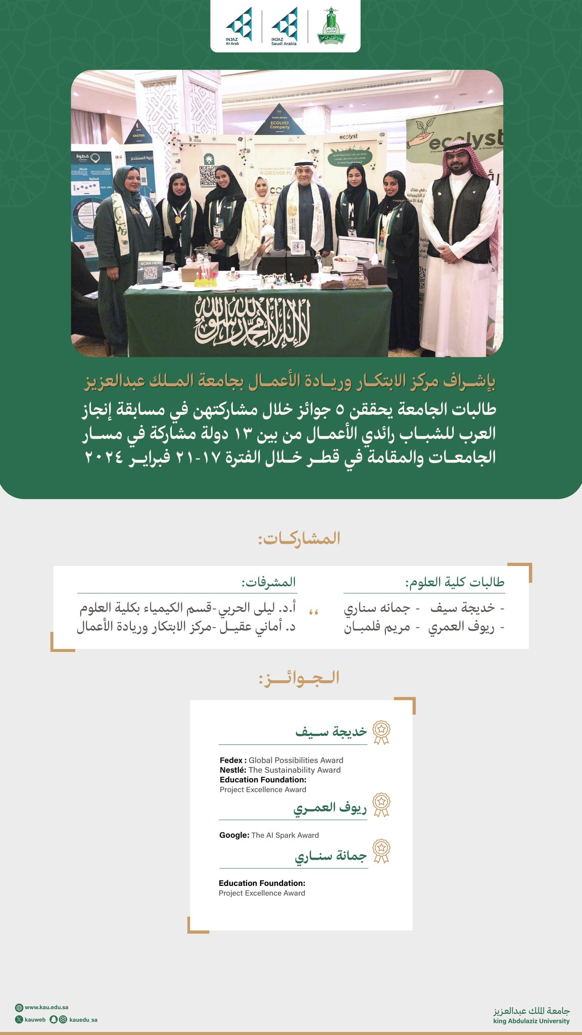 King Abdulaziz University achieved distinguished results at the 2025 Inter-College Environmental Public Speaking Competition, organized by the Emirates Environmental Group